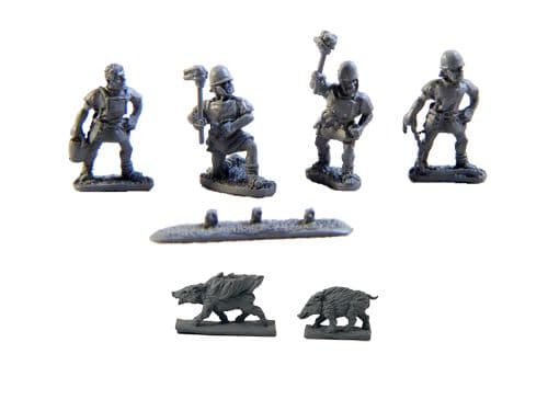 Random mix of 1 torch bearer from 2 different designs and 1 handler from 2 different designs plus 6 pigs; 3 on fire, 3 not on fire, and a strip of tethers.