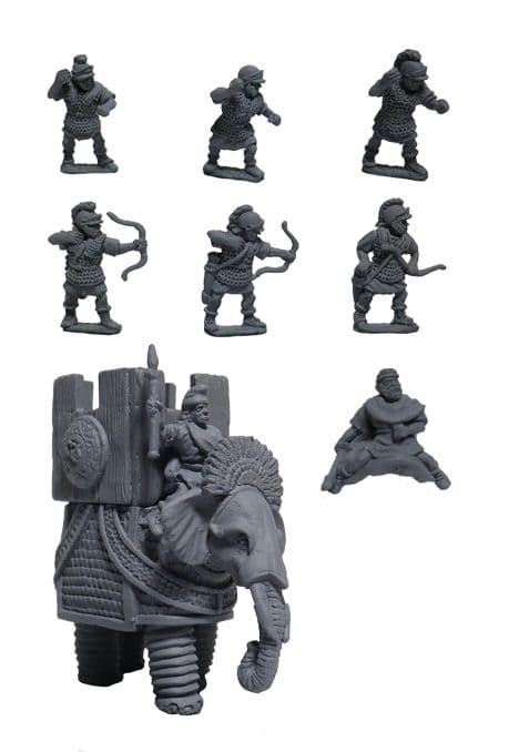 Single model consisting of elephant head, body, War Tower, Crew and Mahout. Model comes with random 1 of 2 elephant heads, random 1 of 2 Mahouts and random 2 of 6 crew.