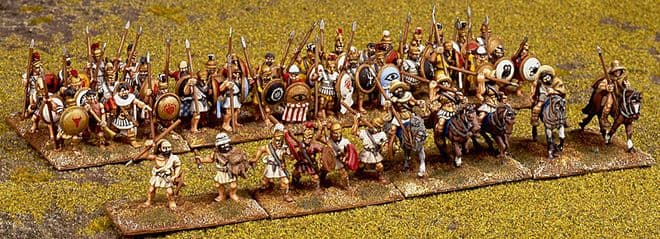Contents: 4 Command (General, Officer & Musicians), 32 Hoplites (Heavy Infantry), 4 Peltasts (Loose Order Infantry), 3 Cavalry, 2 Light Cavalry, 2 Psiloi (Skirmishers).